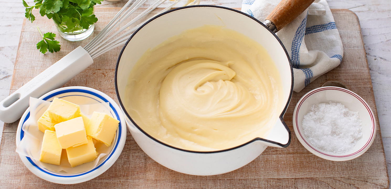 At the beginning of a white sauce always cook off the butter and flour over low heat for 1 minute to ensure the finished sauce doesn’t have a “floury” flavour. Remove from the heat before whisking in milk and returning back to the heat to thicken.